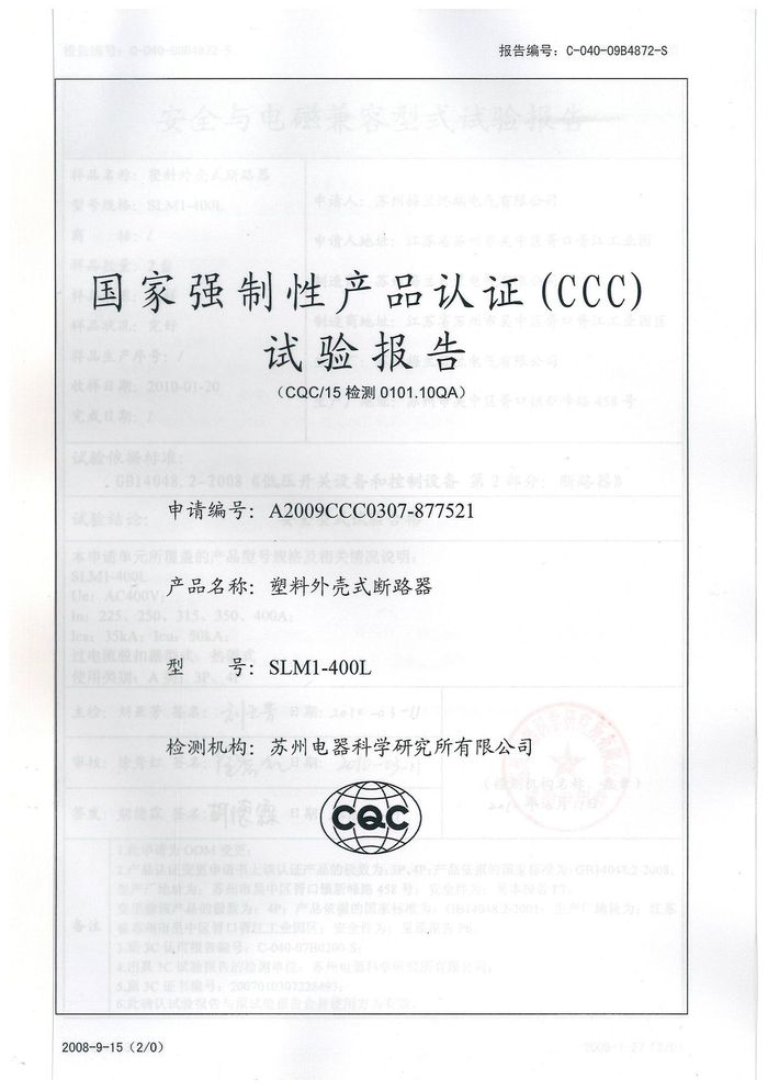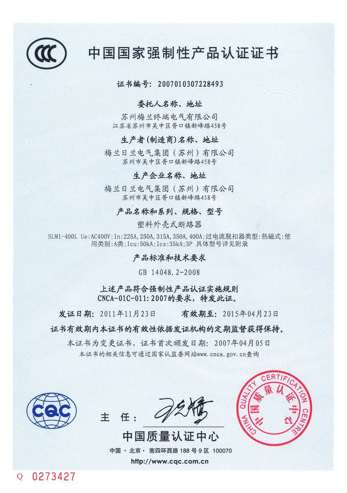 SLM1-400L塑殼斷路器資質(zhì)證書(shū)