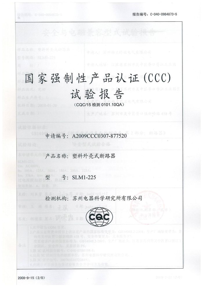 SLM1-225塑殼斷路器資質(zhì)證書(shū)
