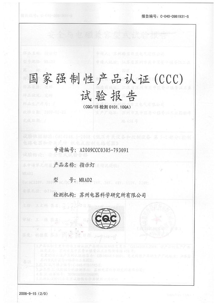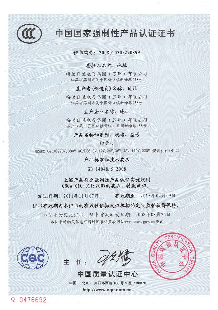 MRAD2指示燈資質(zhì)證書(shū)