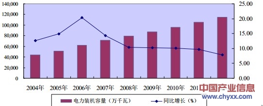 2004-2012年中國發(fā)電總裝機容量連續快速增長(cháng),“十一五”期間年均新增裝機容量近8,500萬(wàn)千瓦,遠高于“十五”期間約4,600萬(wàn)千瓦的年均新增容量。2012年發(fā)電總裝機容量達到11.45億千瓦,2015年,國內發(fā)電機裝機容量將達到14.37億千瓦左右,將超過(guò)美國而躍居世界第一。
