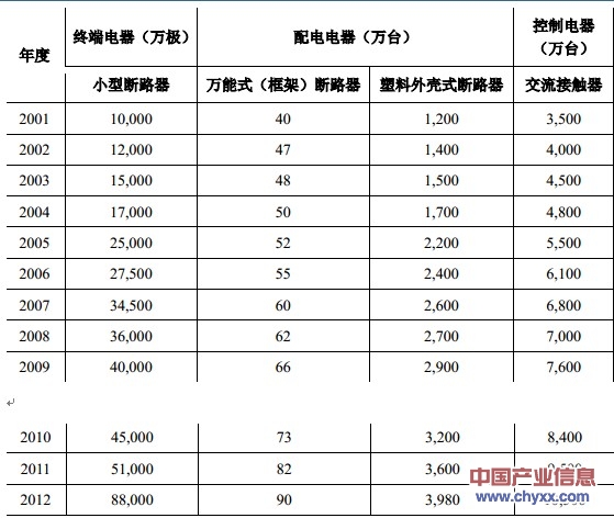 根據中國電器工業(yè)協(xié)會(huì )的統計,2001 年至 2012 年主要低壓電器產(chǎn)品的產(chǎn)銷(xiāo)量呈逐年上升趨勢,低壓電器產(chǎn)品保持較快速度增長(cháng),終端電器、配電電器、控制電器產(chǎn)量復合增長(cháng)率分別為 21.86%、11.41%、10.50%,今后較長(cháng)一段時(shí)間內我國低壓電器市場(chǎng)容量仍會(huì )穩步增長(cháng)。