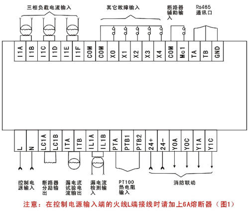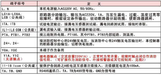 ILIA. ILIB | 漏電輸入端,接零序互感器的輸出端。 RS485通訊口,TA、TB為485信號線(xiàn),GND為信號地 |