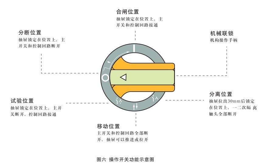 抽屜插入后,將手柄順時(shí)針?lè )较蜣D動(dòng)時(shí),首先到達“試驗位置”(↓),此時(shí)機構將外部電源引入控制回路,用戶(hù)通過(guò)面板上的安全電器(假如有的話(huà))對電路進(jìn)行試操作,以確認其是否符合要求,由于主開(kāi)關(guān)尚處于斷開(kāi)狀態(tài),因此一次回路處于無(wú)電狀態(tài),即使操作結果與要求不符也不會(huì )損壞設備,繼續順時(shí)針?lè )较蜣D動(dòng)到手柄處于水平位置時(shí),即“分斷位置”(0)。此時(shí)一次和二次回路均處于無(wú)電狀態(tài),沿順時(shí)針?lè )较蚶^續旋轉90°則手柄轉到“合閘位置”(I),見(jiàn)圖六。
