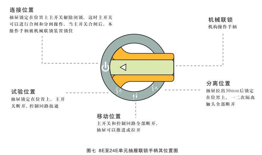 8E/4, 8E/2單元抽屜的操作:這種操作是通過(guò)對抽屜面板上的手柄進(jìn)行操作實(shí)現的,見(jiàn)圖六。只有當手柄上的白箭頭指示“移動(dòng)位置”(↑↓)時(shí),抽屜方可抽出或插入,在其它任何位置上,抽屜都應被鎖定,因此不可能對抽屜實(shí)施抽出或插入操作。此時(shí)不可硬拉或硬拖以免損壞機械聯(lián)鎖機構,抽屜從連接位置抽出30mm(此時(shí)手中工件一輕微震頗感)時(shí)將操作手柄向逆時(shí)針?lè )较蜣D過(guò)45°,抽屜即被鎖定在“分離位置”(↑↓)此時(shí)一次和二次隔離插件均己脫離電網(wǎng)并形成安全間隔。