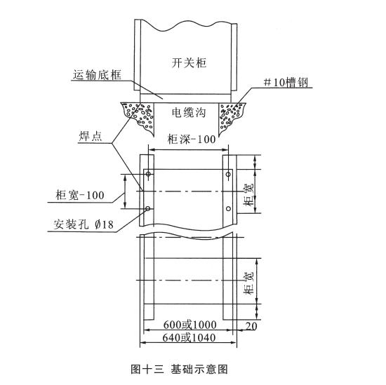 基礎處理:電纜溝的寬度由用戶(hù)自己選定,用10#槽鋼按圖十一方式預埋并與地面平。如果運輸底柜與基礎槽鋼用螺栓聯(lián)接,則基