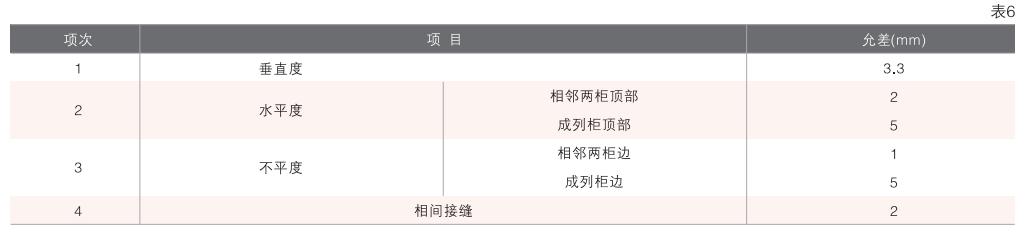 ◆裝置單獨或成列安裝時(shí),其垂直度以及柜面不平度和柜間縫隙的偏差應符合表6規定。