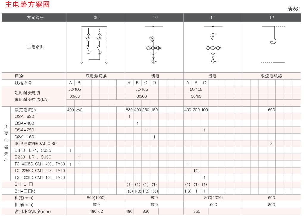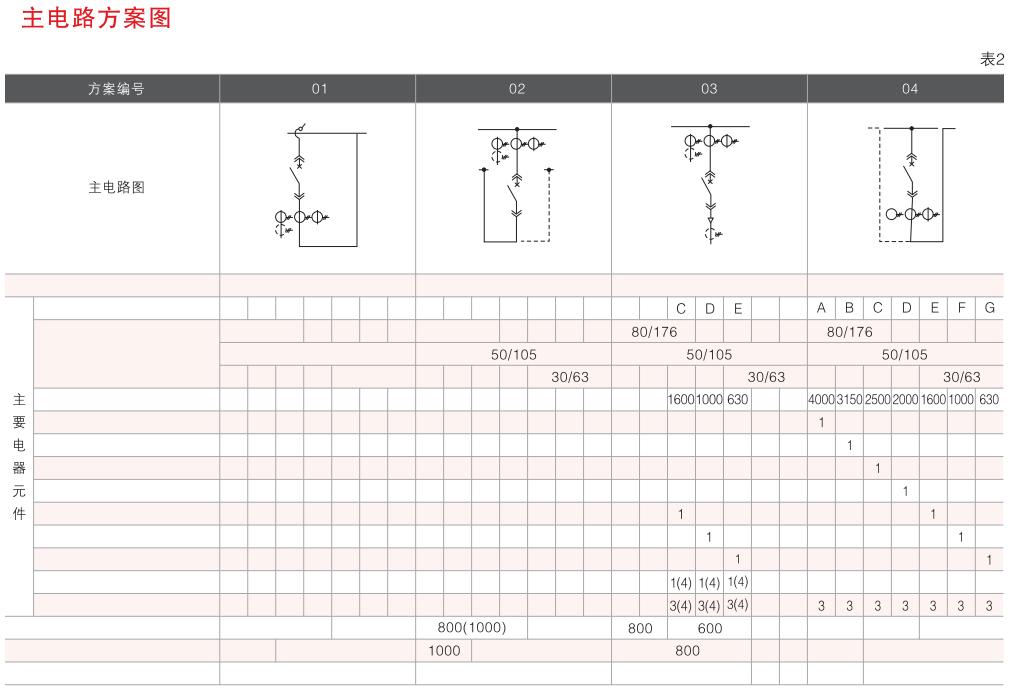 開(kāi)關(guān)設備主電路方案共32組118個(gè)規格(見(jiàn)表2).不包括由于輔助電路的控制與保護的變化而派生的方案和規格。包括了發(fā)電、供用電和其它電力用戶(hù)的需要,額定工作電流為4000A,適合2500kVA及以下的配電變壓器選用。